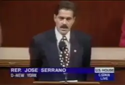 José Enrique Serrano (born October 24, 1943) is an American politician who was a member of the U.S. House of Representatives from 1990 until his retirement in 2021. Serrano, a Democrat from New York, represented a district that is one of the smallest in the country geographically, consisting of a few square miles of the heavily populated South Bronx in New York City. His district was also one of the most densely populated and one of the few majority Hispanic districts in the country. The district was numbered the 18th from 1990 to 1993 and the 16th from 1993 to 2013, and the 15th district from 2013 to 2021. He was the longest-serving Hispanic-American in the House.[2] He did not run for re-election in 2020 due to a diagnosis of Parkinson's disease, and Ritchie Torres was elected to succeed him.[3]