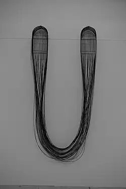Sin Título (Tres jaulas)/Untitled (Three Cages) (1992) is one of Espaliú's most renowned sculptures.[2] Formerly displayed at the Hospital de la Venerable Orden III in Madrid, Untitled consists of a row of three cages hanging which, in lieu of solid bottoms, have wires extending in all directions.[7] Aligned with the materials (cages, crutches) and themes of illness and friendship in Espaliú's later works, Untitled exemplifies how Espaliú, in the final years of his life, "[referred] to his condition and [extrapolated] it into a shared universal order."[1]