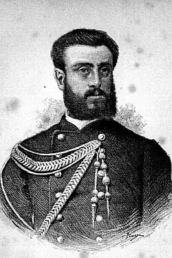 Given the Carlist record of his paternal grandfather[48] and (until the 1860s) of his father, José María seemed poised to follow suit and to adhere to the legitimist cause. Together with his parent and his younger brother in 1868 he moved to France to mount another insurgency.[49] As part of the job he returned to Spain shortly afterwards;[50] engaged in La Escodada, a failed attempt to stage a rising in Navarre,[51] he fled back to France in 1870.[52] In 1872 as cavalry lieutenant[53] he joined insurgency in Gipuzkoa; his first engagement was on May 14, when Carlist units were already in retreat, during the skirmishes at Mañaria.[54] During the clashes at Oñate two days later Orbe's horse was hit twice,[55] but he finally made it to France later that month.[56]