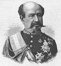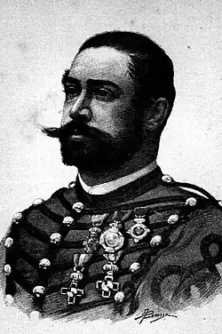 Promoted to capitán and decorated,[69] in the spring of 1874 Orbe was to organize the journey of his queen from Pau to the Carlist capital of Estella.[70] He designed the plan which involved travelling by train, by coach and accompanying camouflage activities, intended to deceive the French;[71] it all worked out and in the summer via Dancharinea Doña Margarita made it to Estella.[72] During the fall of 1874 he was assigned to combat operations in Gipuzkoa, mostly boiling down to failed sieges of Irún and Guetaria. Back in Navarre in early 1875, he took part in the February battle of Lacár. Promoted to comandante and decorated again[73] in the summer of 1875 he accompanied Carlos VII during Jura de Los Fueros in Guernica.[74] From that moment Orbe stayed within his personal escort and is not noted as engaged in frontline combat. Accompanying the claimant to the French frontier, in February 1876 he was promoted to lieutenant colonel[75] and awarded with vizcondado,[76] In Valcarlos Orbe crossed the border bridge with the claimant and decided to join him into exile.