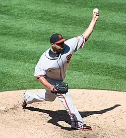 Mijares was claimed off waivers by the San Francisco Giants on August 6, 2012.[11] He pitched in 27 games with the Giants in 2012, going 1–0 with a 2.55 ERA in 27 appearances.[5] In the postseason, Mijares pitched in six games, including in Game 1 of the World Series. He gave up three earned runs in 2+23 innings with three strikeouts.[5] Mijares won his first World Series with the Giants after they defeated the Detroit Tigers in the 2012 World Series.[12]