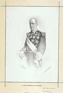 Reportedly, he never wanted to accept the Navy portfolio, but in the Navy he held important positions, both in the Iberian Peninsula and overseas, commanding the Squadrons of the Río de la Plata, the Mediterranean and the North during the Carlist Wars. For his services, he was awarded several Grand Crosses, including the Grand Cross of the Order of Charles III, Grand Cross of Naval Merit and Grand Cross of the Order of Isabella the Catholic, and other decorations, both Spanish (including the Knight 1st Class of the Order of San Fernando and Benemérito de la Patria) and foreign (including Knight of the Order of Franz Joseph and Grand Cross of the Order of the Crown of Italy).[2]