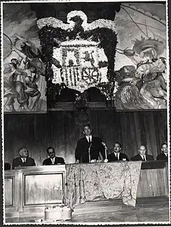 Solís tried to assemble a nationalist project of an alternative regime to that of the Opus Dei technocrats.[25] This project, which had already been partially employed in Labour Unions through an internal opening, was complemented by the creation of "associations" within the movement to equip the Franco regime with a certain level of popular participation in the so-called contrast of views. By October 1958 Solís had already created the National Delegation of Associations with the mission of "widening the bases of accession to the movement to collective groups" and to whose front he had appointed Manuel Fraga Iribarne.[26] As Minister-Secretary General of the Movement, it was essential that the institutions of the Franco regime adapt to the social changes that were occurring in Spain, promoting a "political development" that complements economic growth.[14] However, his association bill – which was already drawn up at the end of 1964 – was parked by the unmoving opposition of the Opus Dei technocrats, the undersecretary of President Luis Carrero Blanco and also by General Franco himself, with the fear that the "associations" could cause the reappearance of political parties.[27][28] Solís continued to battle in this regard, and in the middle of 1969 he promoted a preliminary draft of the bases of the right of association, although again Franco did not want to promulgate it.[29]