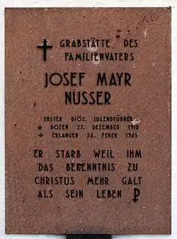 Josef Mayr-Nusser (27 December 1910 – 24 February 1945) was an Italian Roman Catholic who served as the President of the Saint Vincent de Paul Conference of the Bolzano division as well as a member of Catholic Action. He is known best for refusing to recite the Hitler oath after he was drafted as a Nazi soldier and was sentenced to death at the Dachau concentration camp. He died en route to the camp in 1945. He is known as the "Martyr of the First Commandment".[1]