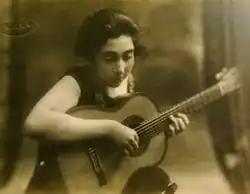 Josefina Robledo Gallego was born in Valencia on 10 May 1897. She was an early disciple of the renowned Spanish guitarist Francisco de Asís Tàrrega y Eixea,[2] and began her musical career in her youth. In 1907, when she was only 10 years old, she gave her first concert at the Valencia Conservatory, and soon her concert career took her to different Spanish cities, achieving fame in the region of her hometown.[3] In 1912, at 15, she traveled to Argentina where she had great success, extending her stay until 1915, when she began a tour of Uruguay, Paraguay and Brazil. At only 18 years old, the guitarist decided to settle down and work as a classical guitar teacher in Sao Paulo and then in Rio de Janeiro, becoming the main disseminator of the Tàrrega school in Brazil.[1][4][5]