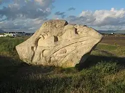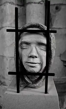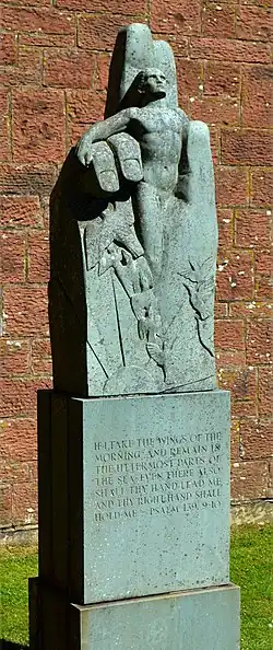 During the Second World War de Vasconcellos began working on a number of large sculptures including The Last Chimera, which is now in the grounds of the Canongate Kirk in Edinburgh and The Hand, a memorial in green slate to a friend killed in the war which now serves as a war memorial for St Bees School in Cumbria.[2] After the war de Vasconcellos and her husband Delmar Banner established a studio in London, while maintaining their home in the Lake District. A joint exhibition of their work was held in December 1946 at the Royal Watercolour Society Gallery off Bond Street with some larger sculptures, including The Last Chimera displayed on a Piccadilly bombsite.[2] This exhibition helped establish de Vasconcellos in the British art world. She became a regular exhibitor at the Royal Academy and at the Paris Salon.[5] In 1948 she became the first female fellow of the Royal British Society of Sculptors, serving on its council and organising committee, and was also a founding member of the Society of Portrait Sculptors in 1953.[5][6][3] Subjects of her portrait busts and sculptures included Lord Denning, Edith Sitwell, Roger Bannister, Norman Nicholson, General Sir William Platt, James Cameron and, in perspex, Tenzing Norgay.[2][5] Other notable commissions included the Prince of Peace (1950), a war memorial in Aldershot (repaired in 1998). In 1955, with the help of students from St Paul's School, she created Mary and Child, a work that remains in the crypt of St Paul's Cathedral.[5] In 1959, she was commissioned by the vicar of St Martin-in-the-Fields in Trafalgar Square in London to construct a Nativity scene of life-sized figures, which became a regular fixture of the church's Christmas display.[5] In the 1990s she designed a memorial to the pilots who were based near her Lake District home during World War Two.[4]