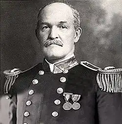 Murdock was promoted to captain on 22 January 1906 and on 30 April 1906 became a member of the Naval Examining Board and of the Naval Retiring Board.[18] He was commanding officer of the battleship USS Rhode Island during the round-the-world cruise of the Great White Fleet between December 1907 and February 1909. He returned to the New York Navy Yard to serve as both its commandant and as commander of the Third Naval District from 15 May 1909 to 21 March 1910.[19][20] and was promoted to rear admiral on 20 November 1909.[21] From 1910 to April 1911 he commanded the Second Division and Battleship Division Three of the United States Atlantic Fleet with the battleship USS Minnesota as his flagship.[22]