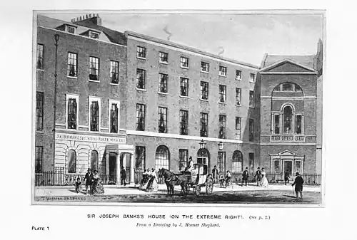 In March 1779, Banks married Dorothea Hugessen, daughter of W. W. Hugessen, and settled in a large house at 32 Soho Square.[17] It continued to be his London residence for the remainder of his life. There, he welcomed the scientists, students, and authors of his period, and many distinguished foreign visitors. His sister Sarah Sophia Banks lived in the house with Banks and his wife. He had as librarian and curator of his collections Solander, Jonas Carlsson Dryander, and Robert Brown in succession.[21]