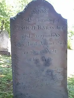 Barss died 3 August 1824 near Kentville, Nova Scotia. Barss is buried in the Oak Grove cemetery at Kentville.