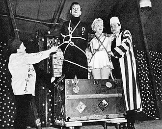 After Welles's return, he and Cotten co-produced The Mercury Wonder Show for members of the U.S. armed services. Opening August 3, 1943, the all-star magic and variety show was presented in a tent at 9000 Cahuenga Boulevard in Hollywood. Featured were Welles (Orson the Magnificent), Cotten (Jo-Jo the Great), Rita Hayworth (forced to quit by Columbia Pictures boss Harry Cohn and replaced by Marlene Dietrich), Agnes Moorehead (Calliope Aggie) and others. Tickets were free to servicemen, and more than 48,000 of them had seen show by September 1943.[15]: 177, 377–378