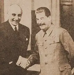 In a chapter entitled "Climax of the Mission", Davies describes a surprising meeting on 5 June 1938. He was visiting Premier Molotov in the Kremlin to make a formal parting before Davies ended his ambassadorship in the USSR and began a new assignment in Belgium. Without any forewarning, Stalin walked into the room, greeted Davies (they had not met before), and initiated a wide-ranging two-hour conversation through an interpreter.[26] When Davies reported this event to the State Department, it "created nothing short of a sensation in the Diplomatic Corps."[27] Davies' account in Mission to Moscow of the topics he discussed with Stalin had to be restricted for reasons of confidentiality, but it was clear that Stalin wished to use Davies as a messenger back to Roosevelt. Recounting one anecdote from the meeting, Davies writes: