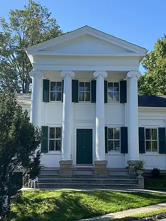 Built circa 1848 by pioneer lumberman Joseph Hall, this structure is thought to be the oldest surviving residence in the town, and is considered one of the few superb examples of the Greek Revival "temple with wings" style to still exist in mid-western and north-central Pennsylvania. The facade features a two-story portico with four fluted Ionic order columns that were constructed of solid trees and a classical pediment (similar to the north facade of the White House).