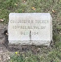 Joseph H. Tucker (c. 1819 – October 22, 1894) was a banker, businessman and Illinois militia colonel during the first two years of the American Civil War (Civil War). He was given initial responsibility for building Camp Douglas at Chicago, Illinois, and was the first commander of the camp. Originally a training camp for Union Army recruits, in 1862 and 1863 Camp Douglas was converted into a prison camp for Confederate States Army prisoners captured by the Union Army. Tucker was commander of the camp from the start of its construction in October 1861 until September 28, 1862, except between February 26, 1862, and June 19, 1862. During this time, the camp was used as a training facility and had its initial use as a prisoner of war camp. Tucker was never mustered into the Union Army, remaining a colonel in the Illinois militia during the term of his service in the Civil War.[1]