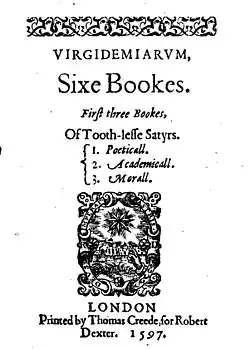 - ^ "Virgidemiarum. Sixe Bookes. First three Bookes. Of Toothlesse Satyrs. (1) Poeticall, (2) Academicall, (3) Morall" (London: Thomas Creede, 1597), 12mo.[4]