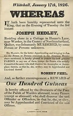 On the evening of Thursday, 3 January 1826 he was murdered in his home by an unknown attacker. Hedley was 76 years old.[16][17] That afternoon he had been at Walwick Grange and had received charitable aid from the farmer there. During the evening a variety of visitors called on him and all recall him being in good health, with the last person to see him alive being a peddler[a] from Stamfordham asking for directions. An hour later when a Mr. Smith of Haughton Castle rode past he noted Joe's cottage was dark and silent. Despite passers-by and herdsman noting the strangeness of the cottage being locked up and silent over the next few days, it wasn't until the Saturday that further inquiry was undertaken.[19]