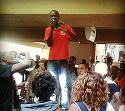 Kalimbwe has participated in African youth activism[13] and was elected student representative council president of the University of Namibia.[14] He was expelled from his Master's programme at the university in 2017 after breaking into a cafeteria with other students to use it as a study area, claiming that there were not enough designated study spaces.[15] He also took part in the FeesMustFall protests in which university students demanded a decrease in university fees. He was later arrested as a result of this campaigning.[16][17][18][19]