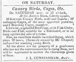 Joseph Lewis Cunningham (1784–1843) or J. L. Cunningham worked as an auctioneer in Boston, Massachusetts, in the first half of the 19th century.[1] Among the many lots he sold were birds, horses, real estate, furniture, sea captains' charts, telescopes, American and European artworks, fishing line, feathers, fabric, guns, musical instruments, fruit trees, flower seeds, printers' equipment, and books.