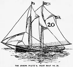She was launched on 21 February 1894 and christened the Joseph Pulitzer. The boat number "20" was painted as a large number on her mainsail, that identified the boat as belonging to the Sandy Hook Pilots. The Pulitzer was one of the finest and best equipped boats in the service. Her furnishings were of hard wood and had a water tank that could carry 16,000 gallons of water.[3][4] She was named in honor of Joseph Pulitzer (1847–1911), a newspaper publisher, and owner of the yacht Liberty.[5][6]