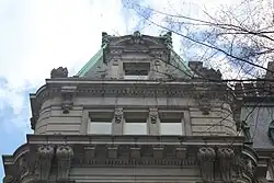 The top two stories are asymmetrical.[13][18] The western (left) pavilion on 37th Street has a rusticated fourth-story facade with a tripartite window; the mansard roof of the western pavilion begins at the fifth story. Within the center and eastern (right) pavilions on 37th Street, the lower half of the fourth story has a smooth facade, while the mansard roof begins at the upper half of the fourth story. The fourth story of the center pavilion has a partial dormer window, whose round pediment protrudes slightly from the roof; there are two smaller windows on either side. Within the eastern pavilion's fourth story, there is a dormer with a segmentally arched pediment above a pair of windows. On the fifth story, there are rounded dormer windows in the center and eastern pavilions and a square dormer in the western pavilion. The copper cresting above the roof has shell decorations.[18]