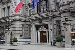 The Consulate General of Poland in New York City opened within the building in 1973[92] and initially had a 75-seat screening room.[93] The building was targeted in a bomb blast in 1976, though it sustained minimal damage.[94] It was also used as a meeting point for demonstrations.[95] In addition, the Polish government began using the building as a polling station in 1989 for the country's parliamentary and presidential elections, Poland's first free election in several decades.[96] The Polish consular office hired Artenova of New York, a local Polish-American restoration firm, to restore the exterior for $200,000 during the early 1990s.[XII][97] The project included fixes to the facade, roof, columns, and copper cresting; the project was completed by 1992.[97] The De Lamar Mansion was one of a few Gilded Age–era buildings remaining in Murray Hill by the beginning of the 21st century.[98] The Polish consulate began hosting recitals and other events at the house in 2006 as part of the De Lamar Mansion Salon of Arts & Ideas program.[99]