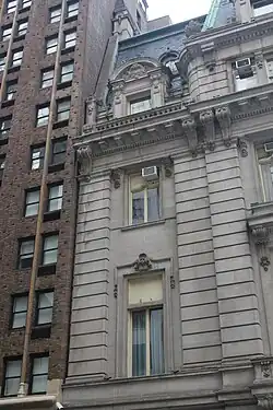 On the 37th Street elevation's second story, the arched French window in the center pavilion is topped by brackets and a central keystone.[14] The outer pavilions' second-story windows have balustrades, which in turn are carried by console brackets with swag motifs. On the third story of the 37th Street elevation, the window sills of the outer pavilions have cornices underneath,[13][14] while the center window has a wrought iron balcony.[14] There are curved transom bars in the third-story windows.[14] The cornice above the third story has console brackets on either end and is decorated with dentils and modillions.[13][14]