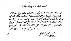 On the evening before his execution on December 30, 1896, on charges of treason, rebellion, and sedition by the Spanish colonial government, the Catholic Church claimed that Rizal returned to the faith and was married to Bracken in a religious ceremony officiated by Father Vicente Balaguer, S.J. sometime between 5:00 AM and 6:00 AM, an hour before his scheduled execution at 7:00 AM.[8][18] Despite claims by Father Balaguer and Bracken herself, some sectors, including members of Rizal's family, disputed that the wedding had occurred because no records were found attesting to the union.