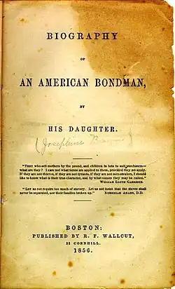 Concerned that his biography was no longer in print, Josephine published Biography of an American Bondman (1856) to preserve his legacy.[1] Begun while Josephine was at school in France, her biography reworks material from Wells Brown's 1847 autobiography while adding additional detail on abuses he experienced while a slave, and the hostility that mulatto slaves experienced from both blacks and whites. Josephine also describes his travels in Great Britain.[1]