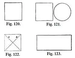 Rose further explained, that it is obviously desirable in a mechanical drawing to present the piece of work in as few views as possible, but in all cases there must be a sufficient number to permit of the dimensions in every necessary direction to be marked on the drawing. Suppose, then, that in Figure 120 we have to represent a solid cylinder, whose length equals its diameter, and it is obvious that both the diameter and length may be marked in the one view given; hence, a second view, such as shown by the circle in Figure 121, is unnecessary, except it be to distinguish the body from a cube, in which the [95] one view would also be sufficient whereon to mark all the dimensions necessary to enable the piece to be made. It happens, however, that a cube and a cylinder are the only two figures upon which all the dimensions can be marked on one view of the piece, and as cylindrical pieces are much more common in machine work than cubes are, it is taken for granted that, where the pieces are cylindrical, but one view shall be used, and that where they are cubes either two views shall be given, or where they are square a cross shall be marked upon the parts that are square; thus, in Figure 122, is shown a cross formed by the lines A B across the face of the drawing, which saves making a second view.[10]