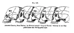 Specifically, in 1854, Nott and George R. Gliddon noted that according to majority of ethnographers and Samuel George Morton's own anthropological works, "the Fellahs of Upper and Middle Egypt, at the present day, continue to be an unmistakable race, and are regarded by most travelled authorities as the best living representatives of the ancient population of Egypt." They would also take the position that, "the iconographic monuments of the IVth, Vth, and VIth dynasties, is closely analogous to the predominant type of that day; which fact serves to strengthen our view that the Egyptians of the early dynasties were rather of an African or Negroid type-resembling the Bishari in some respects, and in others the modern Fellah, or peasantry of Upper Egypt."[20]