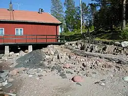 Jotnian sandstone crops out around Södra Björkfjärden in Lake Mälaren.[note 6] Visible outcrops can be found in the locality of Rasta in western Ekerön island and several small islands and islets: Midsommar, Pingst, Gåsholmen, Gåsholmsskäret and Gåsholmshatten, the last three being part of a nature reserve.[29][30] Jotnian sandstone also occurs at the bottom of Björkjärden and studies of glacial erratics suggest there is unexposed Jotnian sandstone to north of the Björkfjärden area, where the outcrops are vestiges of an eroded Precambrian meteorite crater, filled with Jotnian sediments. At Rasta, the basement below the sediments is made of granites and pegmatites of the Svecofennian orogeny.[29]