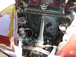 The flat four overhead valve engine of 1486 cc with a compression ratio of 7.2:1 was water-cooled and had an aluminium block and wet cylinder liners. It developed 50 bhp (37 kW) at 4100 rpm (52.5 bhp in the case of the PE) giving the car a maximum speed of 77 mph (124 km/h) and a 0-50 mph (80 km/h) time of 13.4 seconds.[3] Two Zenith carburettors were fitted and PA and PB versions had hydraulic tappets. The radiator was behind the engine. A four-speed gearbox with column change was used. Early cars had gearboxes made by the Henry Meadows company. Later, Jowett made the gearboxes, but the decision to make the gearboxes in-house proved to be a costly mistake.[8] Even though Jowett had some experience in transmission manufacturing, the project went disastrously wrong; powertrainless bodies stacked up in the assembly line because of problems in gearbox production.[9]
