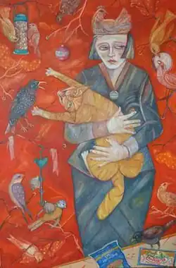 Cairns is a ‘figurative painter of great expressive power’.[3] Her paintings express autobiographical and psychological themes. In the 1970s, mythology was a great influence in her work,[3] but it has been the themes of family, war, and memory that have dominated since. In 2006, Aberdeen Art Gallery hosted a major exhibition entitled War Tourist,[4] an exhibition that recounted the horrors of war in personal terms through her own family history and as a passive observer or war tourist. Cairns visited Tunisia, where her father saw active service, and later Bosnia and the concentration camps of Eastern Europe. The outcome of these travels and years of research were exhibited in 26 large paintings in Aberdeen Art Gallery. Cairns' painting style is rooted in Expressionism[5] and uses iconography to express a narrative. Often working on a large scale, Cairns' preferred medium is oil on board [6] and the artist uses a grid to plan out elements in a composition.