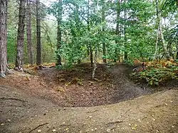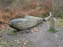 During the Second World War, two RAF Hawker Hurricane fighters crashed in the wood and some hollows visible in the wood are bomb craters.[9] A wooden sculpture of a crashed Hurricane lies just west of Faesten Dic, carved by local sculptor Peter Leadbeater.