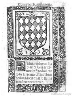 Juan Andres is the writer of the book Sumario breue d'la pratica d'la arithmetica d'todo el curso de larte mercantivol bien declarado.[2] The book, as it is stated in the last page, was written in Zaragoza in 1514 and printed in Valencia in 1515 by the printer Joan Joffre. The book is devoted to D. Serafin, earl of La Oliva and lord of Nules and Pego.