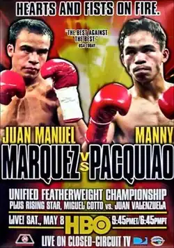 Juan Manuel Márquez vs. Manny Pacquiao, billed as Hearts and Fists on Fire, was a professional boxing match contested on May 8, 2004, for the WBA (Unified), IBF, and The Ring featherweight titles.[2]