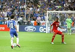 In the 2012 UEFA Champions League final against Bayern Munich on 19 May, Mata assisted Didier Drogba's headed equaliser from a corner kick in the 88th minute. The match went on to extra time and penalties, with Mata taking Chelsea's first, which Bayern goalkeeper Manuel Neuer saved. Chelsea, however, went on to win 4–3 in the penalty-shootout, lifting their first Champions League title.[46] Mata finished his first season at Stamford Bridge with 573 passes, creating 66 chances and completing 61 successful crosses, which all contributed to Chelsea's cup-double winning season.[47] He finished the Premier League season with 14 assists – second highest in the league after Manchester City's David Silva – and six goals.[48]