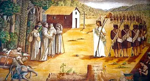 The Juan Santos Rebellion was an Indigenous uprising against the Spanish Empire in Colonial Peru that took place from 1742 to 1752.[1] The rebellion was led by and named after Juan Santos Atahualpa, an Indigenous man from Cusco. Juan Santos had worked as an assistant to Spanish Franciscan missionaries in the Yungas region, and over time he became outraged at the abuses committed by the Spanish missionaries against the local Asháninka tribe, which led him to plan a rebellion against the Spaniards. Juan Santos declared himself to be the reincarnation of Inca emperor Atahualpa, and he managed to gather a large following among the Asháninkas.[2]