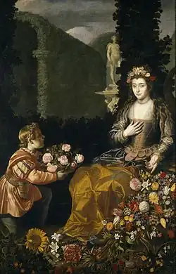 One good example of his work as a flower painter is his Offering to Flora,[3] a visual poem that parallels the lyric verse of his time, in which he united his skills as portraitist and flower painter to produce one of the most beautiful paintings of the allegory of spring. The large canvas, painted in 1627, shows the goddess of the flowers seated besides a cornucopia of spring flowers. The painting adopts a Flemish compositional type and reveals an interest in the play of light on iridescent fabrics that probably derived in the style of Juan Bautista Maino. The offering to Flora and the pair of paintings Still Life with a Vase of Flowers and a Dog and Still Life with a Vase of Flowers and a Puppy formed part of the interior decoration of Jean de Croy's palace in Madrid. Jean de Croy, conde de Solre and Diego Mexia, marqués de Leganés, were Van der Hamen's greatest patrons.