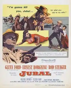 Jubal is a 1956 American Western film directed by Delmer Daves and starring Glenn Ford, Ernest Borgnine, Rod Steiger, Valerie French, and Felicia Farr. Shot in CinemaScope, it was one of the few adult Westerns in the 1950s and is described as Othello on the Range.[3] The supporting cast features Noah Beery Jr., Charles Bronson and Jack Elam.