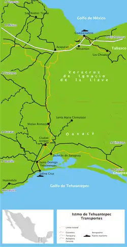 The isthmus has reliable, dominant north-south winds. Some pilot wind farms have been built, notably at La Venta.[4] There are plans to build more, although there has been local resistance due to the communal ownership of land and concerns that the annual rental prices offered are too low[5][6] A plan first proposed in 1977 for a dam in Los Chimalapas has been stalled due to environmental concerns.[3] In June 2008 the State of Oaxaca was again proposing construction of a storage dam in the El Corte River basin in the Chimalapa sub-region, with the potential to irrigate 100,000 hectares of the Isthmus of Tehuantepec and to supply water to the Salina Cruz Refinery.[7]