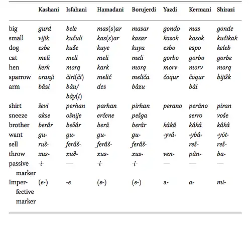 If we look at the chart above, we can see how Judeo-Hamadani is compared to some of the other Judeo-Median Languages. Judeo-Hamadani appears most similar to Kashani in terms of morphosyntax, evidenced by shared passive and imperfect markers. Judeo-Hamadani also shares many lexical items with Judeo-Isfahani, including "throw", "want", "cat", and "dog". This overlap, though notable and suggests similar origins or contact, is not significant enough for these languages to be mutually intelligible. In fact, due to language contact, dialectal shift, and diaspora, none of the Judeo-Median languages are mutually intelligible. According to Habib Borjian, "Tentative studies reveal that Tuyserkani agrees with Hamadani in all major grammatical points and lexical items (Stilo 2003), and that the dialects of Borujerd and Nehavand15 are close (Yarshater 1989)".[4]
