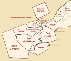 In 1276 the Marinids had founded Fes el-Jdid, a new fortified administrative city to house their royal palace and army barracks, located to the west of Fes el-Bali ("Old Fez").[1][8] Later in the Marinid period the Jewish inhabitants of Fes el-Bali were all moved to a new district in the southern part of Fes el-Jdid. This district, possibly created after the 1276 foundation,[1]: 66 was located between the inner and outer southern walls of the city and was initially inhabited by Muslim garrisons, notably by the Sultan's mercenary contingents of Syrian archers.[1][9] These regiments were disbanded around 1325 under Sultan Abu Sa'id.[8] The district was first known as Hims, but also by the name Mellah (Arabic: ملاح, lit. 'salt' or 'saline area')[10] due to either a saline water source in the area or to the former presence of a salt warehouse.[4][2][8] This second name was later retained as the name of the Jewish quarter.[1] This was the first "mellah" in Morocco; a name and phenomenon that came to be replicated in many other cities such as Marrakech.[11][12][2] (A notable exception being the nearby town of Sefrou.[2])