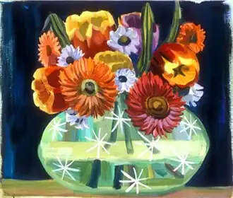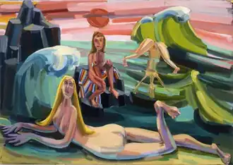 In the 2000s, Linhares has turned to female nudes (often monumental), visionary landscapes, floral still lifes (e.g., Star Vase, 2003), and animals.[11][45] Critic Roberta Smith called the work her most assured,[2] while others suggested that Linhares breathed new life into seemingly exhausted genres.[22][46][1] These "deftly messy images of carefree, meaty stick figures"[1] and "fantastical tableaux" depict nude (or more aptly, nudist) women set against candy-striped skies and terrain—often free of men—picnicking, communing and working in a languid ease that suggests a lightly worn, but confident feminism.[47][48][49][50] John Yau described them as investigations of an alternative world, "Eden before the arrival of Adam and the snake."[14] Painted in bright Fauvist colors that critics described as juicy, madcap, and almost edible,[10][51][52] with blocky, charged, gestural brushstrokes, the paintings seemed to re-imagine de Kooning's violent nudes in an act of identification with the figures.[11]