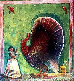 Linhares and critics, such as Dan Cameron, mark a four-month sojourn in Guanajuato, Mexico in 1976 as a turning point that refocused her on painting and integrated her subconscious imagery, painterly and narrative impulses, and Jungian, Surrealist, and Mexican and Outsider Art influences.[9][4][40][14] This evolution was perhaps first realized in the 1977 painting Turkey (featured in the "'Bad' Painting" show), which fused archetypal forces in an uncanny, iconic image.[4]