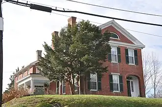 The Judson–Litchfield House is located on Southbridge's south side, on a rise on the south side of South Street. It is a 2+1⁄2-story brick structure, with a front-facing gable roof. Its front (north-facing facade) is three bays wide, with the entrance set in the right bay recessed in a segmented-arched opening, and windows set in openings with granite lintels and sills. The main gable is fully pedimented, with a louvered half-oval opening at its center. A porch added to the left of the building is a later 19th-century addition.[2]