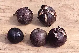 J. regia Zijing was cultivated and named by Wang Xiupo.[1][3] On 17 October 2017, he obtained the certificate of plant variety rights from the State Forestry Administration of China.[4] J. regia Zijing trees have four major purple features, which are female flowers, leaves, peel, and kernels. This is why they are also called Wuzi walnuts (五紫核桃).[5] The trees are mainly distributed in Beijing International Walnut Manor.[1]