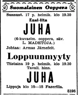 The death of Madetoja's mother, Anna, on 26 March 1934, interrupted his work on the opera; the loss so devastated Madetoja that he fell ill and could not travel to Oulu for the funeral.[6][7][c] Madetoja completed work on the opera by the end of 1934 and it premiered to considerable fanfare at the Finnish National Opera on 17 February 1935, the composer's forty-eighth birthday. The critics hailed it as a "brilliant success", an "undisputed masterpiece of Madetoja and Finnish opera literature".[6] Nevertheless, the "euphoria" of the initial performance eventually wore off and, to the composer's disappointment, Juha did not equal the popularity of The Ostrobothnians. Indeed, today Juha is most associated with Merikanto, whose modernist Juha (which the Finnish National Opera performed on 19 October 1967) is the more enduringly popular of the two; having been displaced by Merikanto's, Madetoja's Juha is rarely performed.[6][4]