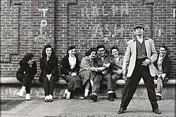 As a street photographer he was influenced by Sid Grossman, Lisette Model, Henri Cartier-Bresson[2] and Brassaï.[6] His work has also been compared to that of Helen Levitt and Leon Levinstein.[7] He took informal photos of people in public places, often without their knowledge. Unlike many of his contemporaries, Aarons chose not to focus on the lives of the downtrodden, writing in his notes: "I resolved to capture the day-to-day life experiences of the people, avoiding scenes of poverty." His street scenes are often lively and vibrant, populated by ordinary people who are portrayed with dignity, evincing a fundamentally humane outlook. He was keenly interested in the way people presented themselves in public: often with flair, as in Boy in Front of Girls, North End, 1955 (shown), in which a young man, presumably Italian-American, strikes a dramatic pose for the camera.[8][9][10][11][12]