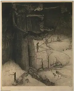 In his large plates from before World War I, such as House of Jan Palfyn, Ghent and Placing the Dragon on the Belfry of Ghent De Bruycker demonstrated the high level of virtuosity he had achieved as an etcher which allowed him to include rich detail and chiaroscuro effects. These works resemble the etchings of the Anglo-Welsh artist Frank Brangwyn, who assisted De Bruycker during the years of his exile in London. Although he produced some city views of London during the war, he mainly worked on large prints, which decried the violence and death that the war had brought to his country. The visual language of these prints drew from the Flemish traditions of Brueghel and Bosch as well as the story of Ulenspiegel. Flemish artists of De Bruycker's generation had rediscovered the art of the Flemish primitives through the exhibition 'Les Primitifs Flamands' ('The Flemish Primitives') held in Bruges in 1902. Each artist had reacted to this rediscovery in a personal way.[3] Ensor's influence can also be seen in a few of De Bruycker's war prints. The preliminary studies for these etchings demonstrate De Bruycker's talents as a draughtsman.[2] During his stay in London, De Bruycker met other artists such as Walter Sickert and got to know the work of James Whistler which influenced his work.