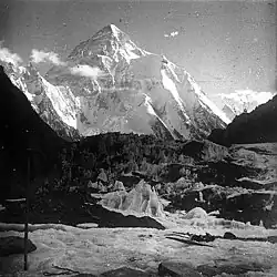 In 1902, Jacot-Guillarmod participated as a doctor in the expedition organised by the Englishman Oscar Eckenstein to try the ascent of the K2 in the Karakoram. The other members are two Englishmen including Aleister Crowley and two Austrians. After landing in Bombay on 21 March 1902, the group crossed India to Askoley, following the maps drawn ten years earlier by William Martin Conway up to Concordia Square on the Baltoro glacier; they were accompanied by a column of 150 porters. From there, the group climbed up to the foot of K2, an area never reached before, but remained stuck for almost two months at base camp at an altitude of 5,700 metres due to bad weather. Jules Jacot-Guillarmod had symptoms of altitude sickness. However, he did not make the connection between altitude and these symptoms. On 10 July 1902 he explored the Northeast ridge of the K2 with one of the Austrians and reached an altitude of 6,700 metres, the highest point of the expedition. The weather conditions deteriorated the following days and one of the climbers suffered from high altitude pulmonary edema. The travellers returned across eastern India, where they stayed for seven months. Jacot-Guillarmod brought home from this expedition nearly a thousand stereoscopic photographs revealing regions little or not at all known at the time.[3][4] Two years later, Jacot-Guillarmod himself organized an expedition, this time to the Nepalese and 8585m high Kangchenjunga near Everest. His expedition consisted of two Swiss men and Aleister Crowley, whom he met during the K2 expedition in 1902. For the organisation of the expedition in Darjeeling, they called upon an Italian hotelier who knew the local language. From Darjeeling, the group advanced on the border between Sikkim and Nepal.[2] After climbing through the Yalung Chu valley, the summit is surrounded by a very steep glacier, now known as The Bottleneck. Three Nepalese carriers and a Swiss participant lose their lives, falling into a crevasse at an altitude of 6,500 metres. The expedition was subsequently abandoned, and the return journey through the Sikkim mountains was made without Crowley, who fled after the avalanche with the remainder of the money Jacot-Guillarmod had provided for the expedition.[2] Jacot-Guillarmod later recovered this money by blackmailing Crowley, threatening to publicly disclose some of his pornographic poetry.